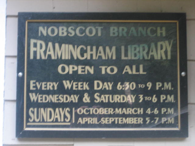 Since 1905, however, the Framingham Pubic Library occupied half of the building, which is only twelve by twenty-four feet. It was called the Nobscot Depository and it hung on into the post-war period when Nobscot was being rapidly developed, finally closing in 1953. When the nearby railroad line was active and still ran passenger trains, there was a window at the rear of the building where railroad tickets were sold.